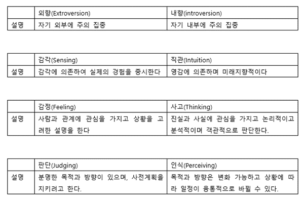 그림에서 보이는 바와 같이 에너지의 방향에 따라 에너지의 방향이 바깥을 향하여 폭넓은 관계를 지향하는 외향형(E)과 에너지의 방향이 자신을 향하여 좀 더 깊은 관계를 내향형(I), 사물을 인식하는 방식에 따라 감각형(S)과 직관형(N), 결정 방식에 따라서 사고형(T), 감정형(F), 삶의 패턴에 따라서 판단형(J), 인식형(P)으로 구분하여 총 16가지의 유형을 나누게 된다. 각각에 대한 간단한 설명을 아래 표에 적어두었다.