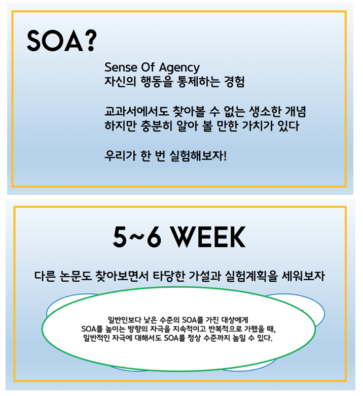 ‘자신의 행동을 통제하는 경험 혹은 자각’이라는 Sense of Agency에 대해 탐구해보는 프로젝트입니다. Sense of Agency는 아직 교과서에서도 제대로 찾기 힘든, 새로이 연구되고 있는 개념입니다. 하지만 SOA 프로젝트 팀은 이것이 생소한 개념이라도 충분히 탐구할 만한 가치가 있다고 생각합니다. SOA팀은 실제 연구 논문을 읽어보며 이 개념에 대해 공부합니다.