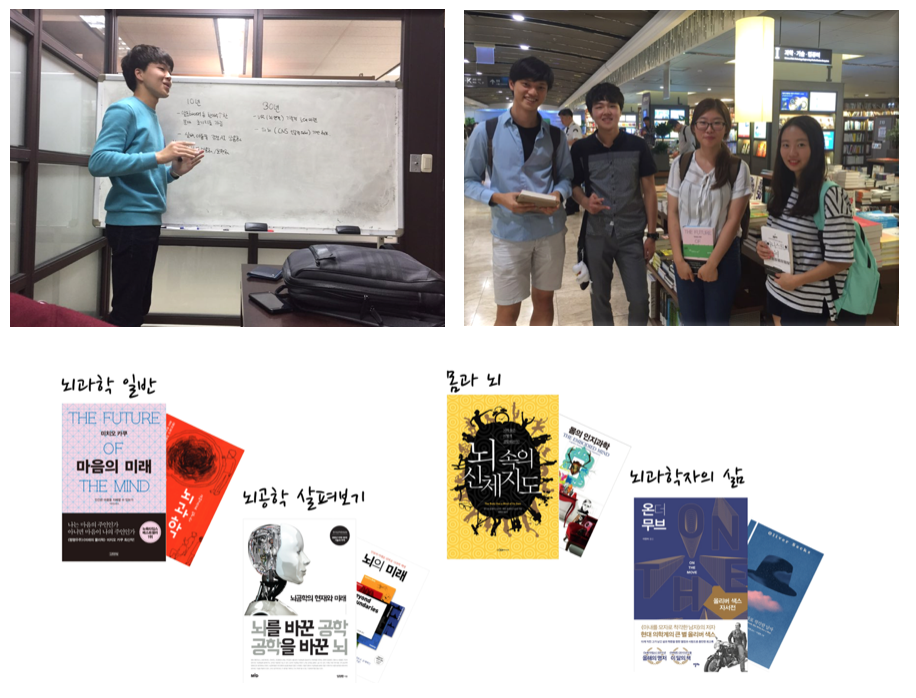 ‘책벌레’라는 의미로 Book + C.elegans = ‘B.elegans’라는 이름을 가진 프로젝트 팀입니다. 한 학기 동안 여러 권의 뇌과학 관련 도서를 읽으며 자유롭고 다양하게 뇌과학에 대해 탐구해봅니다. 이번 학기에 탐구한 주제로는 ‘뇌과학 일반’, ‘뇌공학 살펴보기’, ‘몸과 뇌’, ‘뇌과학자의 삶’이 있습니다.